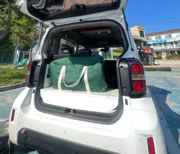트렁크를 열면 하얀색 서랍과 가방이 보이며, 이 안에 필요한 캠핑용품들이 들어 있습니다. 특히 초록색 가방 안에는 에어매트가 들어 있어, 2인이 사용하기에 적당합니다. 공간은 넉넉하지 않지만, 가성비를 따지면 충분히 괜찮은 선택입니다.