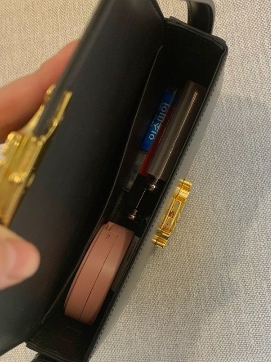 정말 손바닥만한 사이즈지만 실물은 더 귀엽고, 실제로 보면 작다는 느낌이 들어요. 하지만 너무 귀여워서 그런 점이 오히려 매력 포인트가 되더라고요. 쿠션, 차키, 립스틱 2개 정도가 딱 들어가는 크기인데요,
