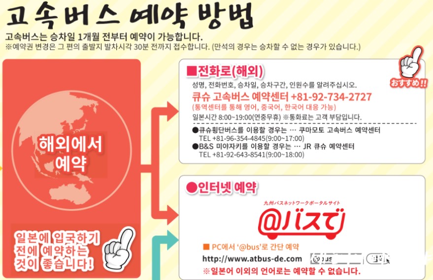 큐슈 고속버스센터에 전화로 예약할 수 있으며, 한국어 직원도 있어 편리합니다.