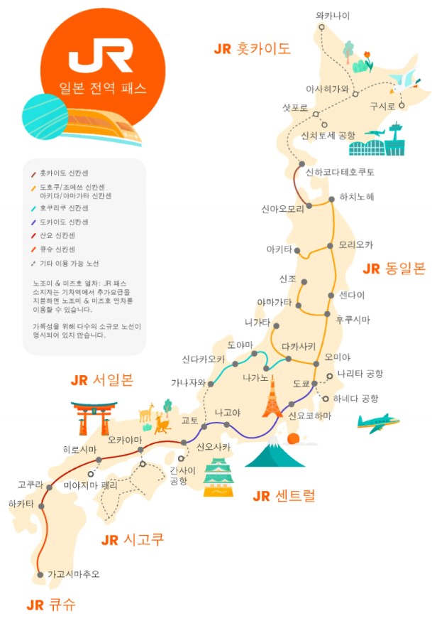 후쿠오카부터 삿포로까지 일본 전역을 이용할 수 있는 JR패스는 같은 컬러 구간에서는 추가 요금 없이 이용할 수 있습니다. 노조미 열차를 이용해야 하는 경우 추가 요금이 발생하므로 같은 컬러 구간별로 환승하는 편이 경제적입니다.
