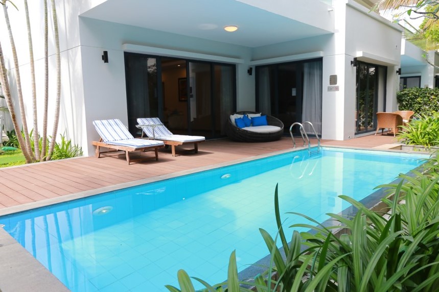 가족끼리 물놀이를 즐기고 싶어 풀빌라로 예약했기 때문에, 가장 먼저 수영장을 확인했습니다. 수영장은 꽤 큰 편이었고, 물도 깨끗해서 탄성 소리가 절로 나왔습니다. 선 베드에 누워서 선탠을 하며 휴식을 취할 수도 있었고, 수영장 근처의 야자나무와 다양한 식물들 덕분에 숲 속 호수에서 수영하는 기분을 만끽할 수 있었습니다.