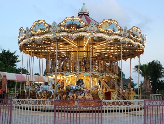 빈펄랜드의 회전목마는 클래식한 놀이기구로, 모든 연령층이 즐길 수 있습니다. 아름다운 음악과 함께 돌아가는 말에 올라타면 마치 동화 속 주인공이 된 듯한 기분을 느낄 수 있습니다. 특히 어린이들에게 인기가 많으며, 사진 찍기에도 좋은 장소입니다.