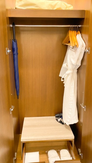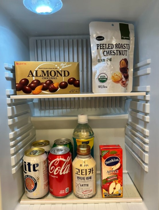 수건은 여유 있게 제공되며, 매일 청소를 요청하면 수건도 똑같이 채워줍니다. 커피, 차, 커피포트도 준비되어 있어 컵라면을 먹을 때 유용했습니다. 미니바는 초콜릿, 알밤, 맥주 2캔, 콜라 2캔, 사과주스 1개로 구성되어 있고, 1회 무료로 제공됩니다. 3박 동안 물은 매일 2개씩 무료로 제공됩니다.