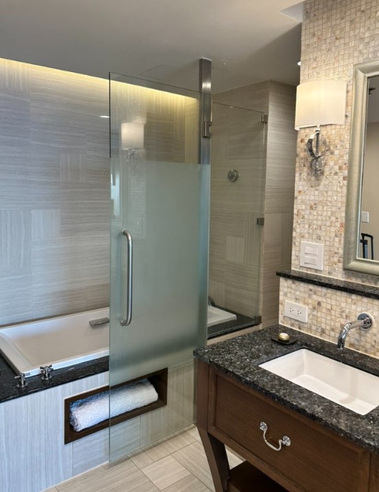 욕조는 오픈된 공간에 있어 약간 어색할 수 있지만, 샤워 공간은 별도로 문이 있어 개인 공간을 확보할 수 있습니다.