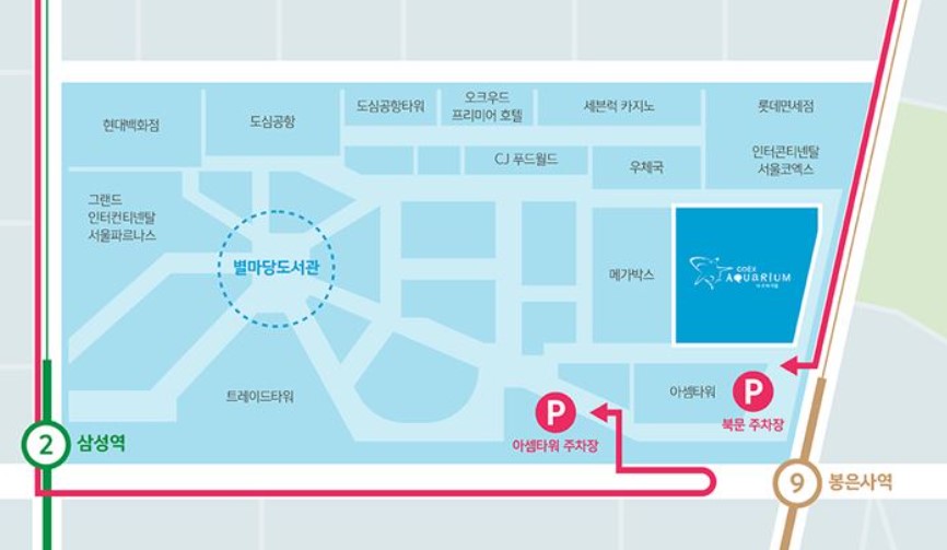 아쿠아리움을 차량으로 방문하시는 분들을 위해 주차 시설도 잘 마련되어 있습니다. 북문(GATE4) 주차장으로 들어오면 편리하게 주차할 수 있습니다. 맞은편에 봉은사가 있으니 네비게이션을 이용해서 찾아오시면 됩니다.