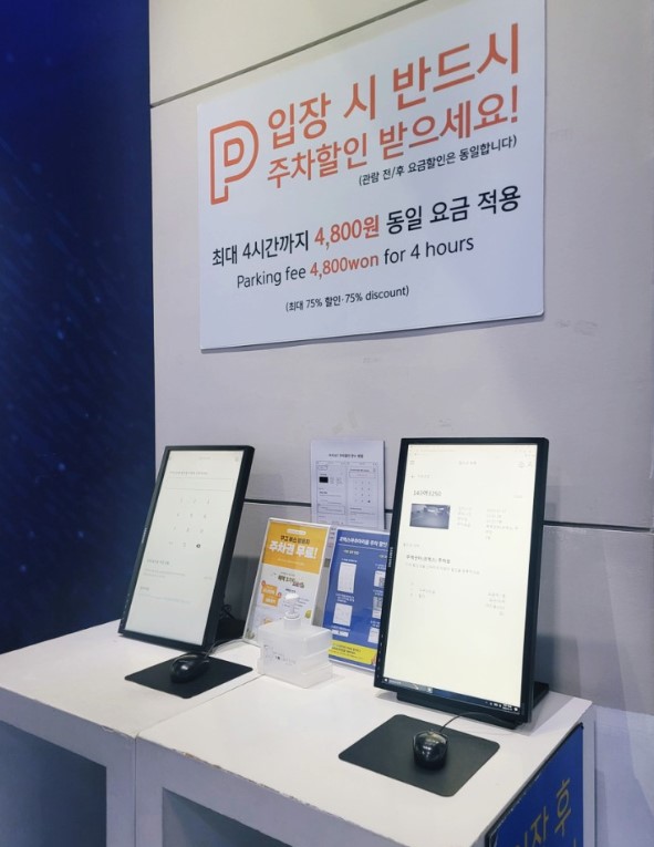 주차 요금은 4시간에 4,800원이며, 주차 후 주차할인기기에 차량번호를 입력하여 요금을 정산해야 합니다. 주차요금할인기는 입장 후 관람시작 전에 하셔야 합니다. 사람들이 많아서 쉽게 찾을 수 있습니다.