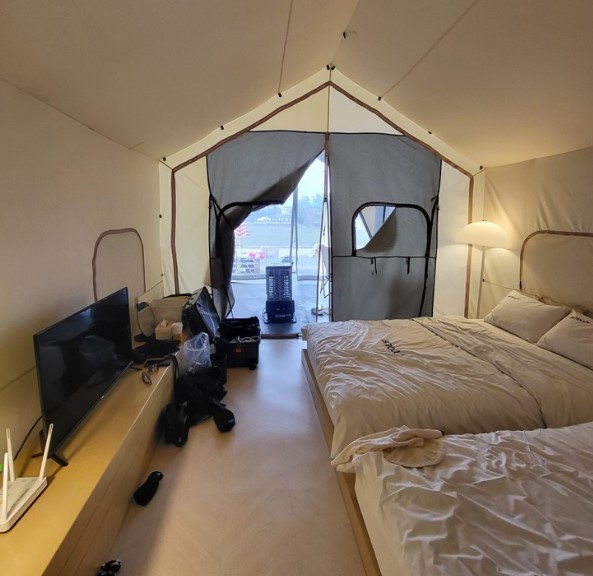 침실에는 두 개의 퀸사이즈 침대와 케이블 방송이 나오는 TV까지 설치되어 있어 글램핑장의 분위기와 깨끗함이 돋보입니다. 호텔식 침구와 은은한 분위기는 캠핑의 불편함을 느끼는 분들에게도 좋은 선택이 될 것입니다.