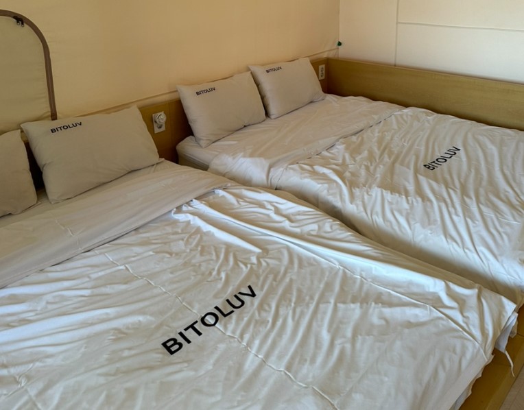침실에는 두 개의 퀸사이즈 침대와 케이블 방송이 나오는 TV까지 설치되어 있어 글램핑장의 분위기와 깨끗함이 돋보입니다. 호텔식 침구와 은은한 분위기는 캠핑의 불편함을 느끼는 분들에게도 좋은 선택이 될 것입니다.
