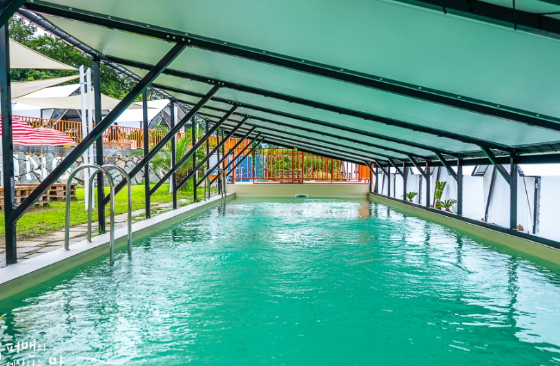 경남 사천글램핑에는 야외 수영장도 있어서 이용할 수 있습니다. 수영장에는 천막이 쳐져 있고 쉴 수 있는 공간도 마련되어 있습니다. 사계절 미온수가 제공되어 언제든지 수영을 즐길 수 있으며, 수영장 길이도 제법 길어 물놀이를 하기에 좋습니다.