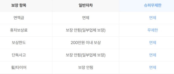 슈퍼무제한 보험은 휴차보상료, 단독사고, 휠/타이어 등 일반자차에서 보상되지 않는 부분까지 포함되어 있어 더욱 편안한 여행을 즐길 수 있습니다.