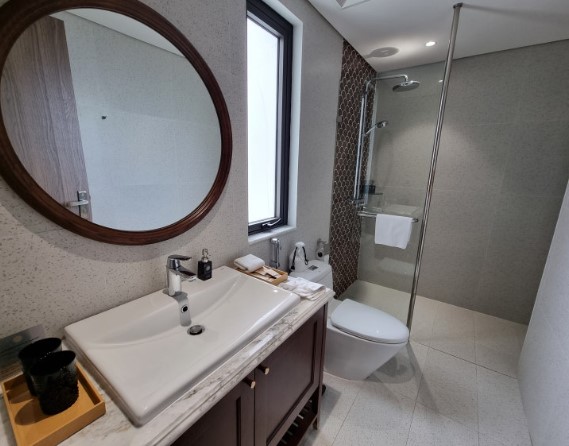 화장실도 매우 깔끔하게 관리되어 있었고, 수압이 강해 샤워하는 데 불편함이 없었습니다. 또한, 샤워기 필터와 배수 상태도 완벽했으며, 제공되는 어메니티는 샴푸, 트리트먼트, 바디워시, 핸드워시까지 다양하게 갖추고 있었습니다.