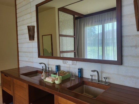 화장실도 큼직하여 호사를 누리는 기분을 느낄 수 있었습니다. 수건걸이 겸 건조대가 따로 마련되어 있고, 중앙에는 큼직한 자쿠지가 있어 멋진 뷰를 바라보며 스파를 즐길 수 있었습니다. 세면대가 두 개나 있어 순서를 기다릴 필요 없이 사용할 수 있었고, 모던한 거울과 깔끔한 세면대가 인상적이었습니다.