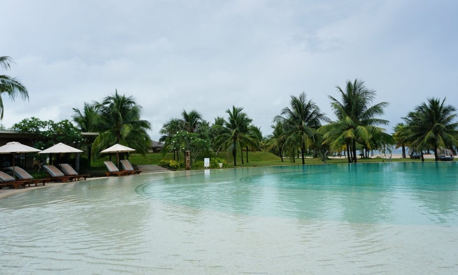 리조트의 공용 수영장은 큰 원형으로 되어 있어 개인 풀장과는 또 다른 매력을 지니고 있었습니다. 그라데이션 형식으로 중앙으로 갈수록 짙어지는 색감이 해변의 바닷가를 연상시켰습니다. 공용 수영장은 이용하는 사람이 적어 수질이 매우 좋았고, 쾌적하게 물놀이를 즐길 수 있었습니다.
