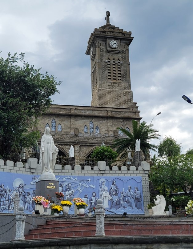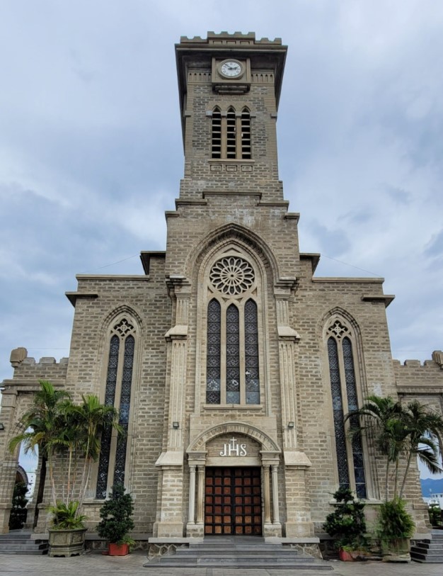 시내투어의 두 번째 코스는 나트랑 대성당입니다. 이곳은 나트랑 시내 중심에 위치한 고딕 양식의 성당으로, 프랑스 식민지 시절인 1928년에 지어져 1934년에 완공되었습니다. 나트랑 대성당은 웅장하고 멋진 외관과 내부 장식이 인상적입니다.