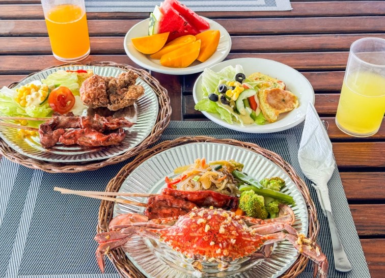 물놀이를 즐긴 후 먹는 점심은 그야말로 꿀맛이죠. 깔끔하게 준비된 뷔페식 점심은 맛도 훌륭했어요. 물놀이를 하고 나면 망고나 과일 같은 달콤한 간식들이 특히 더 맛있게 느껴지잖아요. 과일들도 준비되어 있어서 신선하게 즐길 수 있었습니다.