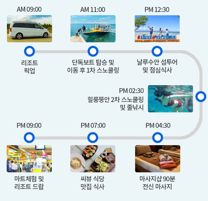 종일투어는 아침에 한국인 가이드님과 현지 운전기사님이 호텔 앞으로 픽업을 와주셔서 아주 편리했어요. 가이드님이 한국인이셔서 언어 문제도 전혀 걱정할 필요 없었고요. 픽업 후 보트로 이동해, 하루 종일 세부의 맑은 바다에서 수영하고 놀며 정말 행복한 시간을 보냈답니다.