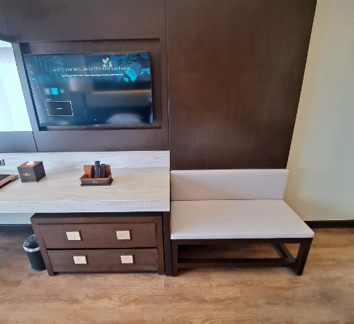 작은 테이블도 있어 간단한 간식이나 음료를 즐기기에 좋았고, 화장대는 깔끔하게 정리되어 있었습니다. 방에서 보이는 바다 전망은 일출과 일몰을 감상하기에 완벽했고, 이곳에서의 시간을 더욱 특별하게 만들어 주었습니다.