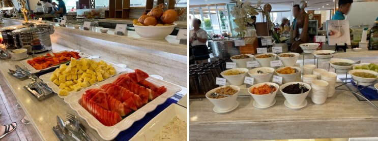 조식에는 다양한 과일도 준비되어 있었지만, 기대했던 망고는 나오지 않았습니다. 대신 파인애플, 수박 등의 열대 과일이 제공되었는데, 파인애플이 가장 맛있었습니다.