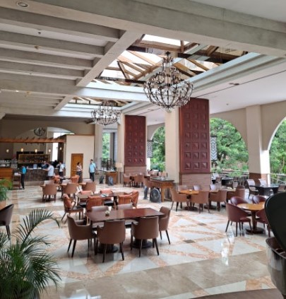 하지만 레스토랑이 넓고 테이블도 많아 여유롭게 식사를 즐길 수 있었습니다. 자리 배정도 빠르게 이루어졌고, 창가에 앉아 정원 뷰를 보며 조식을 즐겼습니다.