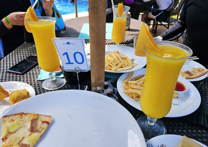 메뉴로는 하와이안 피자, 치킨 너겟, 프렌치프라이 등 다양한 간식 메뉴가 준비되어 있으며, 망고주스와 산미구엘 맥주도 인기 있는 선택입니다. 수영을 하다가 배가 고프면 아일랜드 바에서 간단하게 에너지를 충전해 보세요.