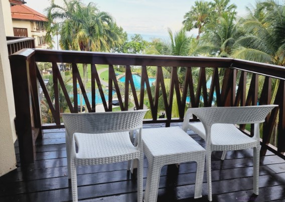 발코니에는 작은 의자와 테이블이 마련되어 있어 차 한 잔을 하며 여유로운 아침을 맞이하기에 딱 좋은 공간이었습니다. 다만, 리조트 전체의 고급스러운 분위기에 비해 발코니의 하얀 의자와 테이블은 살짝 어울리지 않는다는 느낌이 들기도 했습니다.