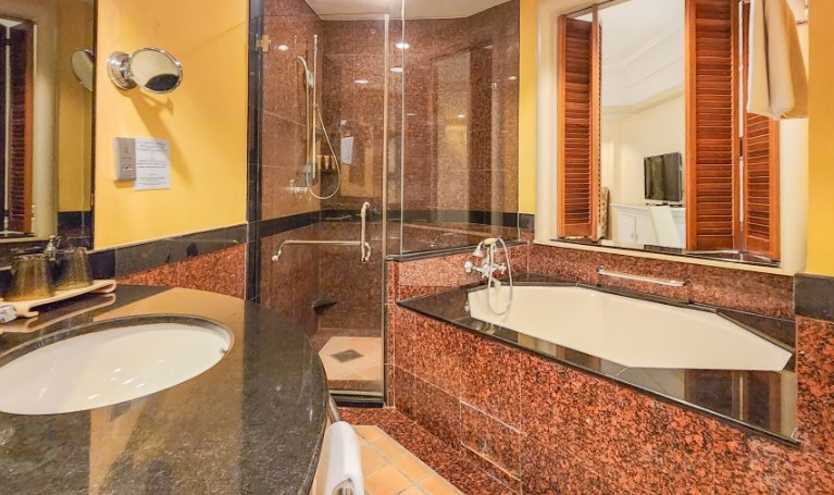 객실 내 욕실 인테리어 또한 인상적이었습니다. 전체적으로 진한 브라운 톤으로 꾸며져 있었고, 분위기가 살짝 무거운 느낌이 들기도 했습니다. 특히, 욕조는 팔각형 모양으로 되어 있어 독특했으며, 샤워실은 유리로 분리되어 있었습니다.