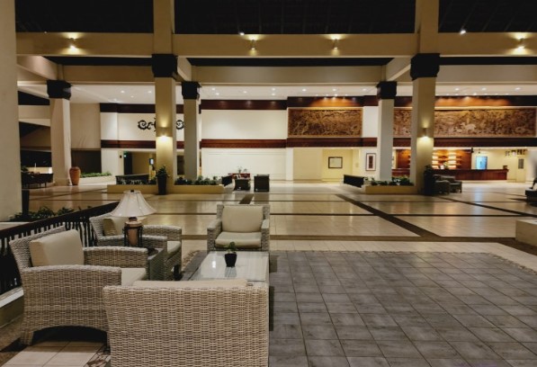 리조트 로비는 마치 강당 같은 분위기로 꾸며져 있었고, 브라운 톤의 인테리어가 마치 박물관 같은 느낌을 주었습니다.