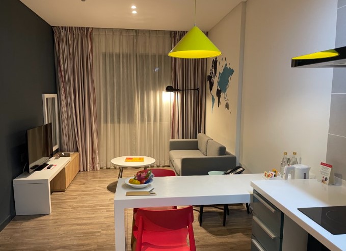 이비스 사이공 에어포트 호텔은 여러 객실 타입을 보유하고 있으며, 그 중에서 상위 객실 타입인 스튜디오 킹 룸을 소개합니다. 이 객실은 기본형 룸과 달리 거실이 분리되어 있어 넓고 쾌적하게 사용할 수 있습니다.