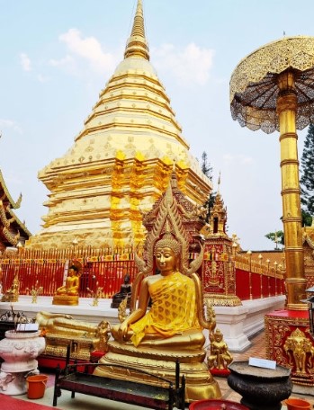첫날 일정의 하이라이트는 바로 치앙마이에서 가장 유명한 사원 중 하나인 도이수텝 사원이었어요. 도이수텝은 치앙마이 시내를 내려다볼 수 있는 산 정상에 위치한 사원으로, 황금빛으로 빛나는 건축물이 인상적인 곳이에요.