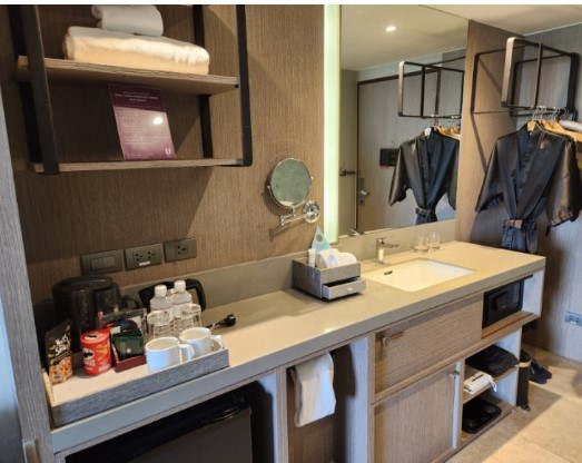 객실에는 커피머신과 커피포트, 냉장고가 있으며, 냉장고에는 매일 무료로 음료가 제공됩니다. 음료 종류로는 콜라, 맥주, 이온음료, 주스 등이 있어, 객실 내에서 간편하게 음료를 즐길 수 있습니다.