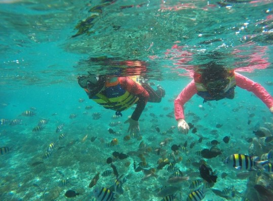두번째 스노클링 장소인 길리 트라왕안 또한 여행의 하이라이트 중 하나였습니다. 참고로 스노클링 장비와 오리발은 모두 대여할 수 있었고, 우리는 수영복만 챙겼습니다. 스노클링 시작 전, 선크림을 꼼꼼히 바르고 다시 바닷속 모험을 준비했죠.