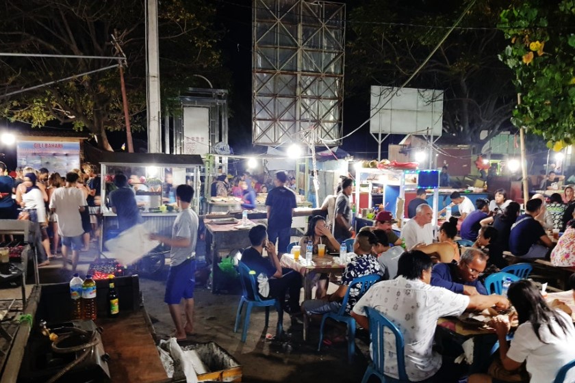 길리섬의 하루를 마무리하는 방법은 바로 길리 야시장입니다. 이곳은 작지만 매력 넘치는 현지 시장으로, 다양한 꼬치 음식과 나시짬뿌르 같은 현지식이 판매되고 있습니다.