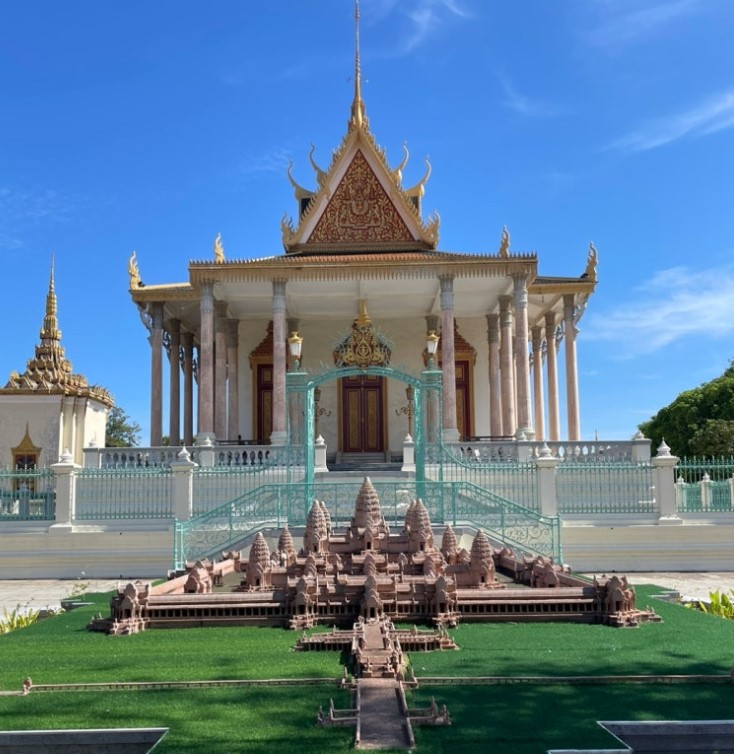 둘째 날, 아침 7시에 일어나 호텔에서 조식을 즐긴 후, 프놈펜의 주요 관광지인 프놈펜 왕궁으로 향했습니다. 왕궁은 캄보디아의 왕이 거주하는 곳으로, 19세기 후반에 건립된 이 왕궁은 프놈펜의 대표적인 건축물입니다.