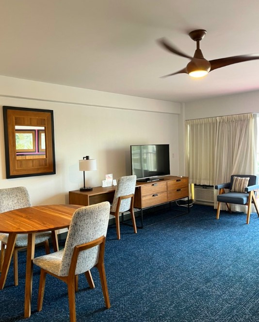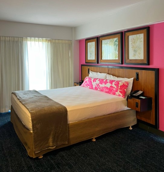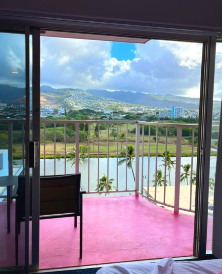 객실 내부는 핑크색 인테리어로 꾸며져 있었는데, 처음에는 다소 촌스럽다고 느껴졌지만, 시간이 지날수록 이 색상이 오히려 매력적으로 다가왔습니다. 침대는 매우 크고 편안했으며, 하와이의 따뜻한 날씨에도 불구하고 습도가 낮아서 실링팬만으로도 충분히 시원하게 지낼 수 있었습니다.