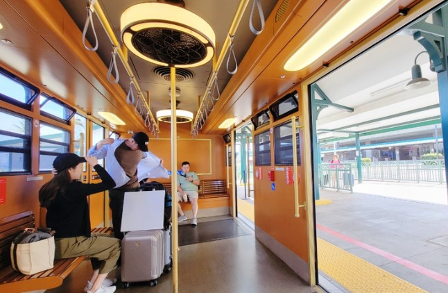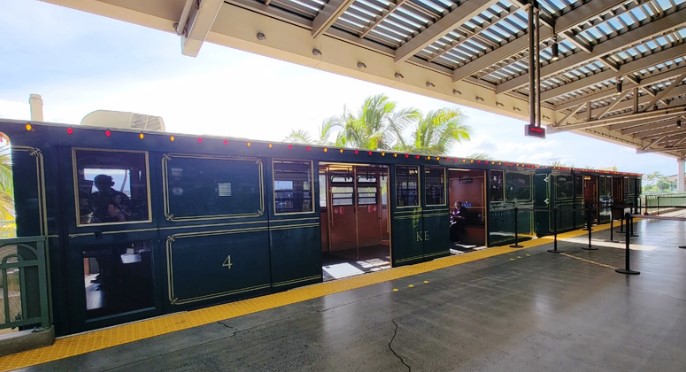 트램 내부는 나무 의자로 되어 있으며, 하와이 특유의 올드한 분위기가 느껴져 이동하는 동안 마치 관광하는 느낌을 받을 수 있습니다. 트램을 타고 3정거장 정도 이동하면 렌터카 센터에 도착하게 됩니다.