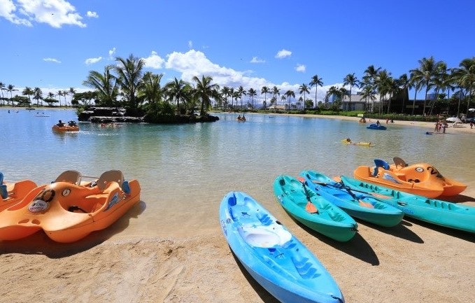 힐튼 하와이안 빌리지에서 가장 큰 매력 포인트 중 하나는 바로 Lagoon입니다. 와이키키 해변 근처에서 라군을 가진 숙소는 드물기 때문에, 힐튼 하와이안 빌리지만의 특별한 장점이라고 할 수 있습니다. 이곳에서는 카약, 스노클링, 그리고 다양한 무동력 해양 스포츠를 즐길 수 있어, 물놀이를 좋아하는 가족들에게 안성맞춤입니다.