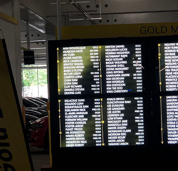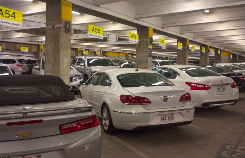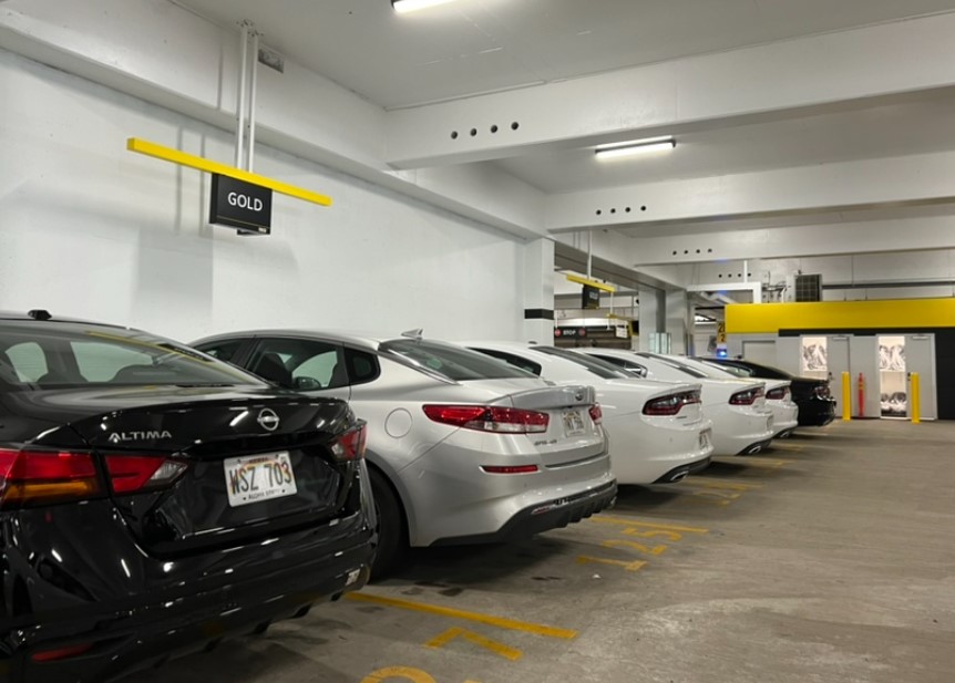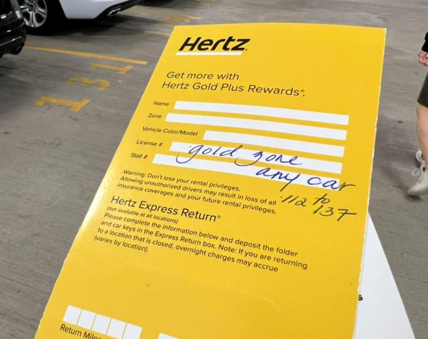 허츠의 GOLD 멤버십을 이용하고 있는 경우, 안내보드에서 이름을 확인 후 전용 주차구역으로 이동하여 차량 키를 받습니다. 이후 출구에서 렌탈 계약서와 결제 관련 서류를 확인받습니다.