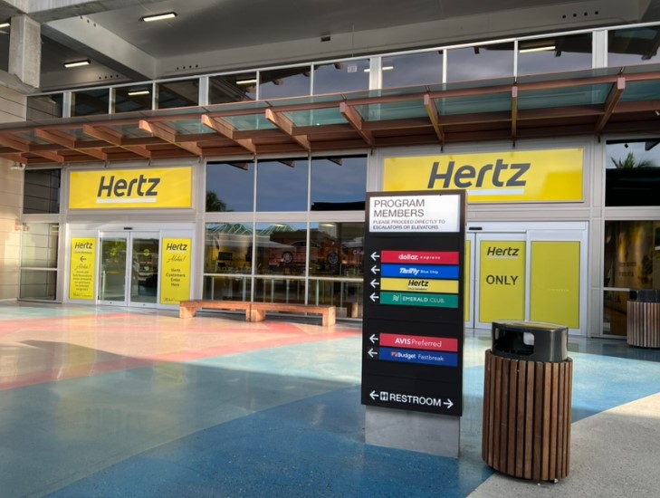 렌트카 빌딩에 도착하면 길을 건너 에스컬레이터를 타고 올라가면 됩니다. 에스컬레이터를 올라오면 바로 허츠 렌터카가 보입니다. 허츠 외의 렌트카 회사들은 허츠 입구 옆쪽에 있는 에스컬레이터를 타고 한 층 더 올라가야 합니다.