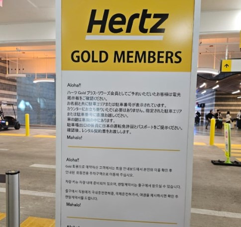 허츠의 GOLD 멤버십을 이용하고 있는 경우, 안내보드에서 이름을 확인 후 전용 주차구역으로 이동하여 차량 키를 받습니다. 이후 출구에서 렌탈 계약서와 결제 관련 서류를 확인받습니다.
