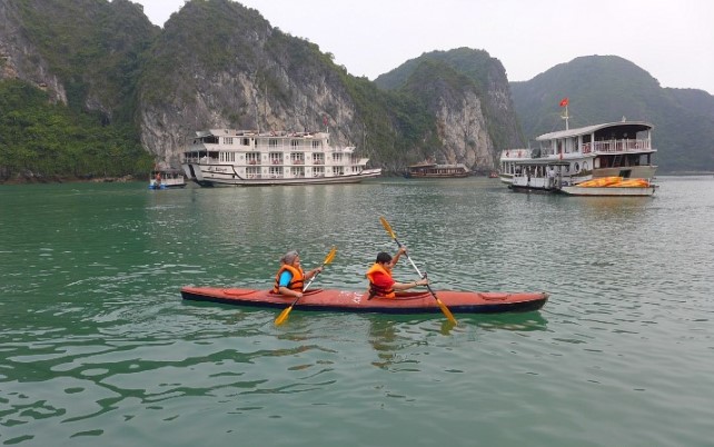 동굴 탐험 후에는 카약을 타고 조용한 바다를 직접 누비며 하롱베이의 맑은 물과 바람을 온몸으로 느낄 수 있어요. 물놀이를 좋아하는 분들은 바다에서 수영을 즐기며 한층 더 자유로운 시간을 보낼 수 있습니다.