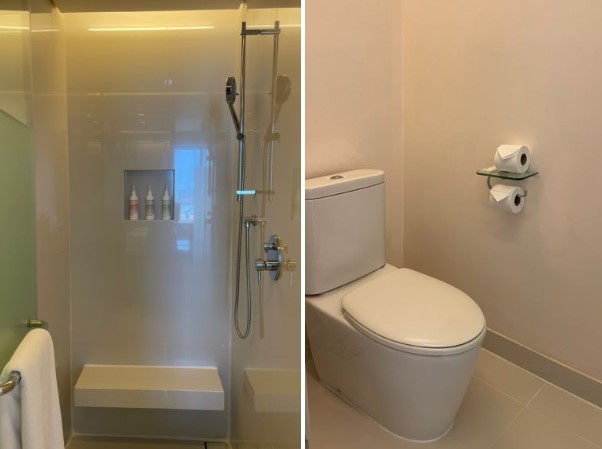 샤워실은 레인 샤워기가 설치되어 있었고, 수압도 적당해 여행으로 지친 몸을 풀기에 좋았습니다. 수건과 목욕 가운도 충분히 제공되어 불편함 없이 사용할 수 있었어요.
