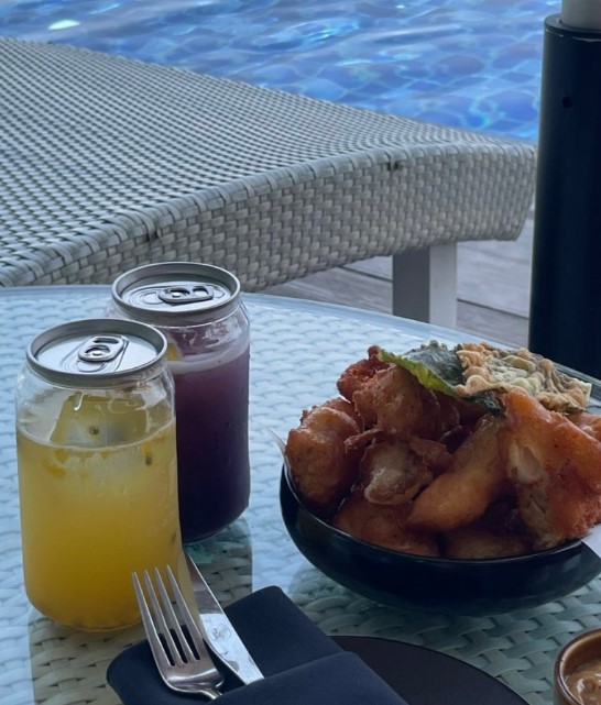수영장에서 휴식을 취하며 매운 치킨과 목테일을 주문해 먹었는데, 매콤한 소스와 바삭한 튀김이 정말 잘 어울렸습니다. 저녁이 되면 다양한 메뉴를 즐기며 수영장 옆에서 간단하게 식사도 할 수 있어요.