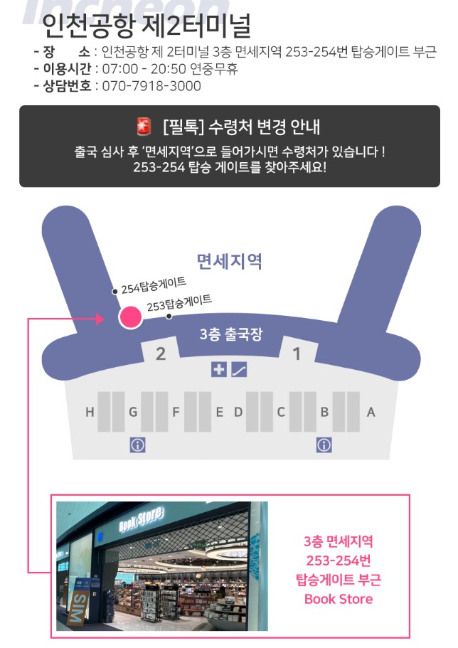제2터미널의 경우 출국 심사 후 탑승게이트 253~254번 근처에서 수령이 가능하니 조금 서둘러 가야 할 수도 있습니다.