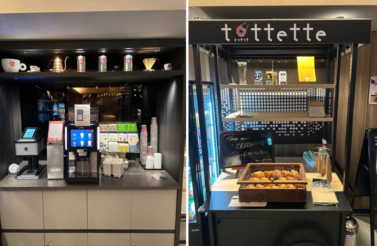 조식은 아침 7시부터 9시 30분까지 제공되며, 성인 1인 기준 2,200엔입니다. 하지만 조식 신청을 하지 않아도 이 호텔에서는 무료 크로아상과 커피, 심지어 맥주까지 제공해줍니다. 매일 아침 6시 30분부터 재료 소진 시까지 제공되는 크로아상은 맛이 아주 훌륭하며, 친구와 저는 매일 무료로 제공되는 지역 맥주도 즐겼습니다.