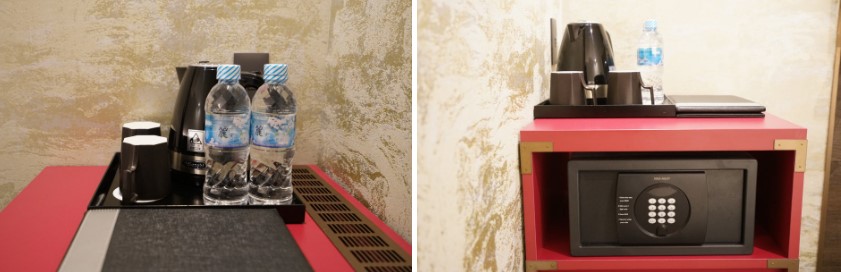 또한, 객실 내 미니 냉장고와 세이프티 박스도 구비되어 있어 소지품을 안전하게 보관할 수 있습니다. 옷장을 대신해 욕실 맞은편 벽면을 옷장처럼 활용할 수 있는 공간이 있었으며, 침대 옆 조명 버튼으로 등 조절도 가능해 매우 편리했습니다.