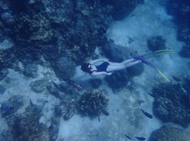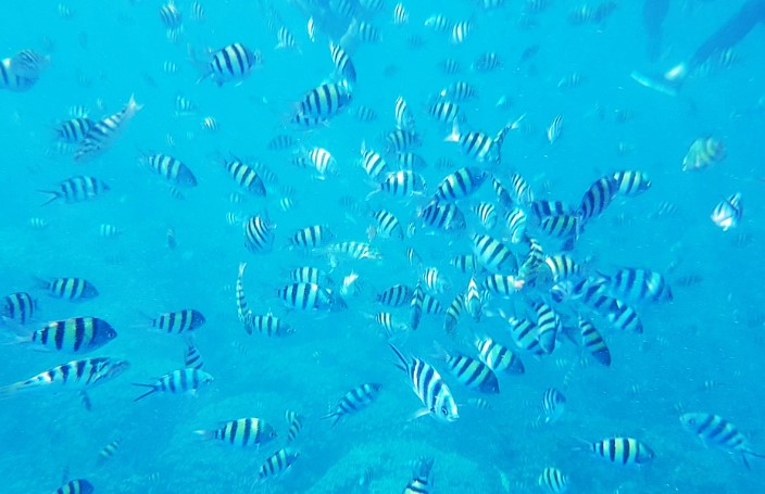 스노클링 시간이 약 30분 정도였는데, 물속에 들어가니 정말 많은 물고기들이 저를 반겨줬어요. 괌 바다는 물이 정말 깨끗해서 물고기들이 마치 손에 닿을 것처럼 가까이 다가왔답니다.