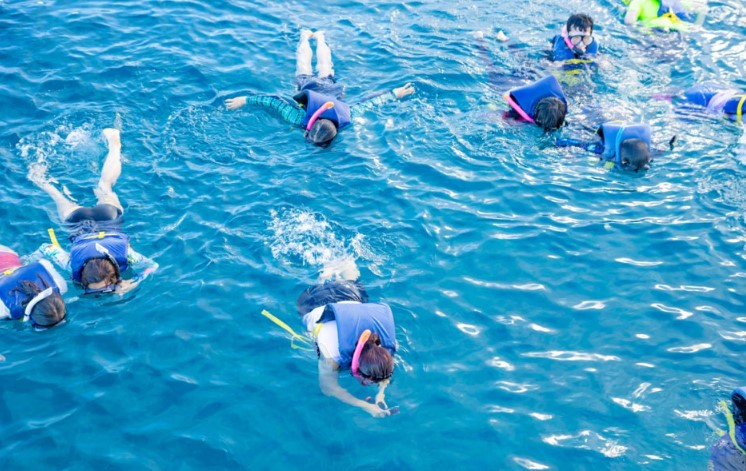 돌고래 구경을 마치고 나서, 이번에는 스노클링을 할 차례였어요. 괌의 맑은 바닷속에서 스노클링을 즐기며 수많은 열대어들을 가까이서 볼 수 있었어요. 스노클링할 때는 기본적으로 구명조끼를 착용해야 했는데, 장비는 현장에서 대여가 가능했어요. 저는 개인 장비를 준비했기 때문에 따로 빌리지 않았지만, 필요한 분들은 대여하시면 돼요.