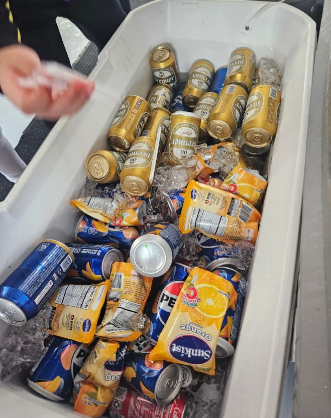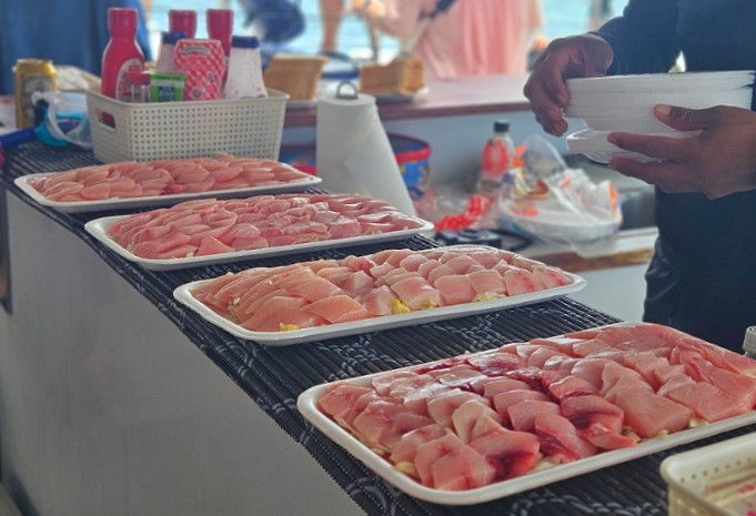 낚시를 하면서 점점 출출해질 무렵, 드디어 선상에서 참치 회 파티가 열렸답니다. 참치 회와 함께 제공된 과자, 음료, 맥주는 배 위에서 간단하게 점심을 해결할 수 있도록 해주었어요.
