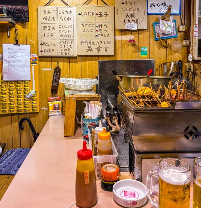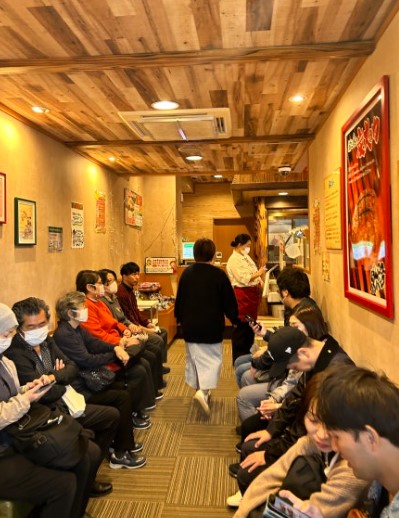 골목에는 이미 현지인들과 관광객들로 북적거렸어요. 가게 안에는 손님들이 옹기종기 모여 앉아 오뎅을 즐기고 있었고, 가게 바깥에도 사람들이 서서 오뎅을 먹고 있었어요. 이곳은 전형적인 일본의 작은 오뎅집들처럼 아담하고 소박한 분위기를 자랑했답니다.