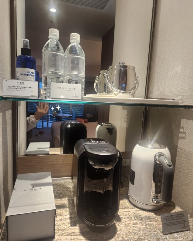 기본적으로 샴푸, 컨디셔너, 바디워시 등의 욕실 용품이 준비되어 있을 뿐만 아니라, 커피포트와 생수, 다양한 차와 커피가 구비되어 있어 방 안에서 간단한 음료를 즐기기에도 부족함이 없었습니다.
